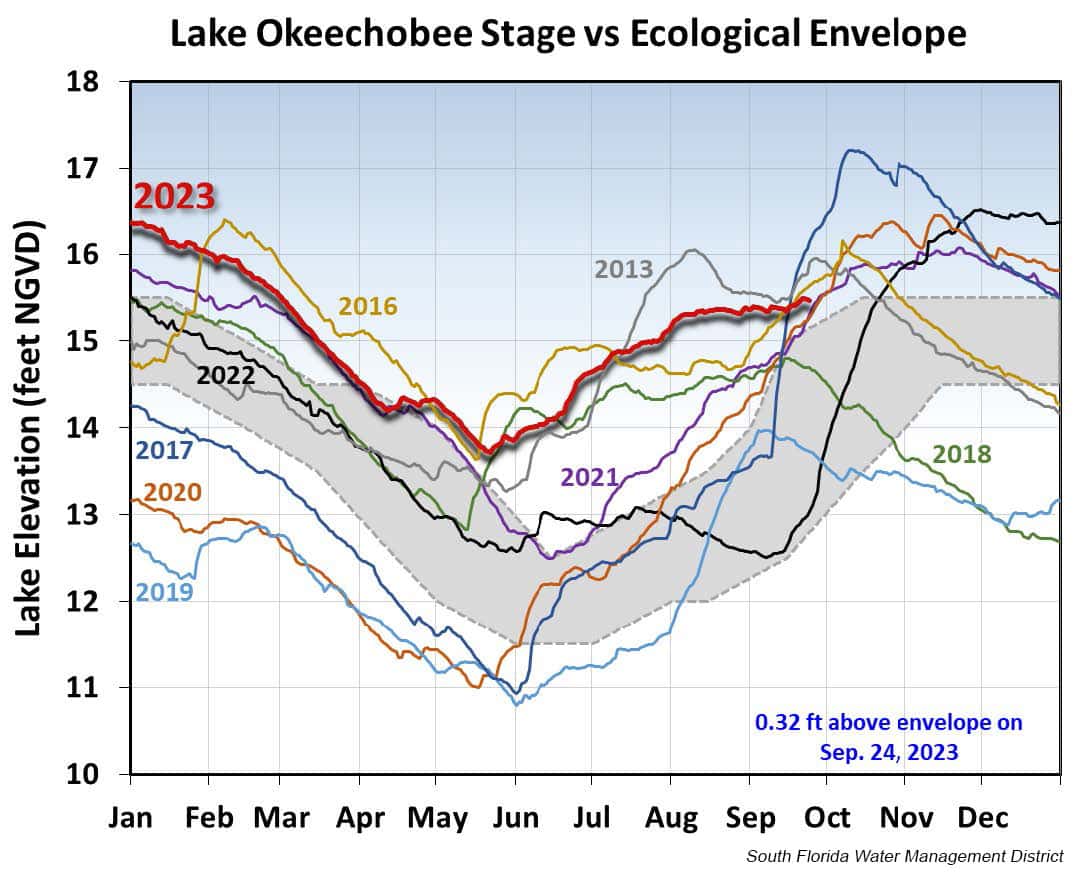 The rise in Lake Okeechobee levels has slowed down in the past few months, putting it closer to the top of the ecological envelope, which is the range that provides ecological benefits to the Lake’s ecosystem. Major blue-green algae blooms have ended on the lake.