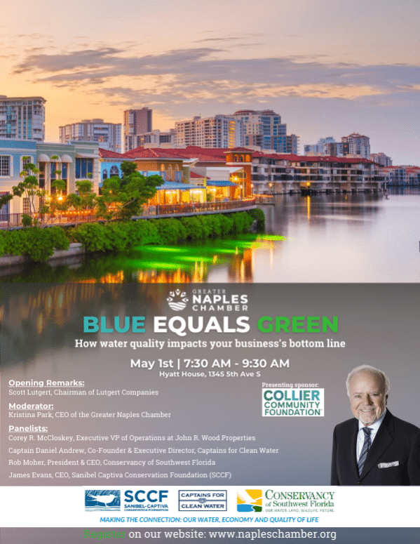The Naples Chamber is hosting a vibrant discussion on how ‘Blue Equals Green,’ focusing on how water quality impacts the bottom line on May 1, from 7:30 to 9:30 a.m. at The Hyatt House. With opening remarks by Scott Lutgert, Chairman of The Lutgert Companies, the conversation will center upon a recent analysis of the economic repercussions of degraded water quality.