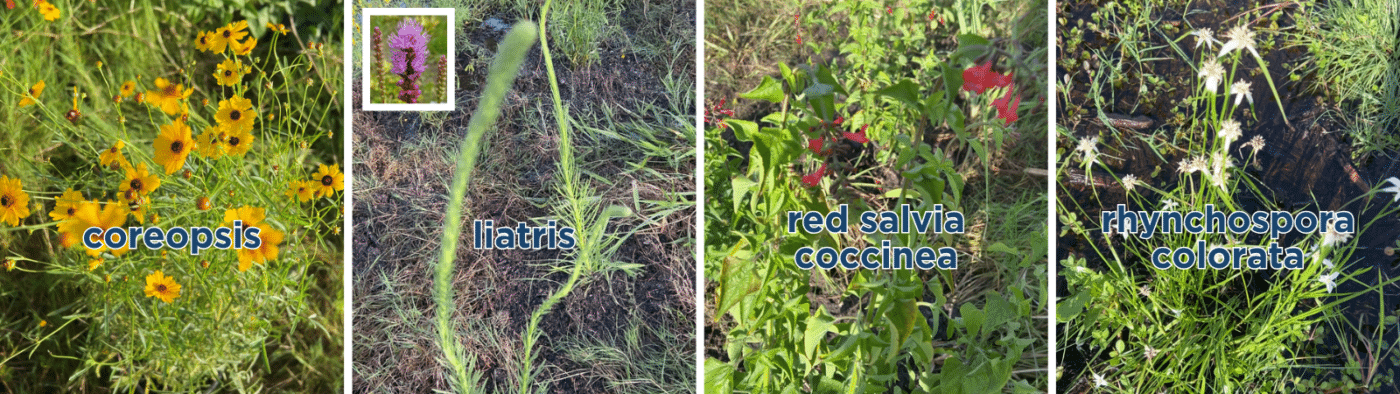 Volunteers planted a variety of wildflowers, including coreopsis (tickseed), liatris (blazing stars), red salvia coccinea (scarlet sage), and rhynchospora colorata (starrush whitetop). Skye McDonald-Newman, our Coastal Watch technician, affectionately referred to the newly planted coreopsis as “little splotches of sunshine.”