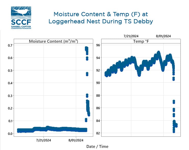 “Data from our moisture and temperature loggers indicate that some nests experienced a significant drop in temperature and increased moisture as the tide influenced the clutch,” said Coastal Wildlife Director Kelly Sloan. “The temperature in the nest displayed below dropped about 10 degrees during the storm.”