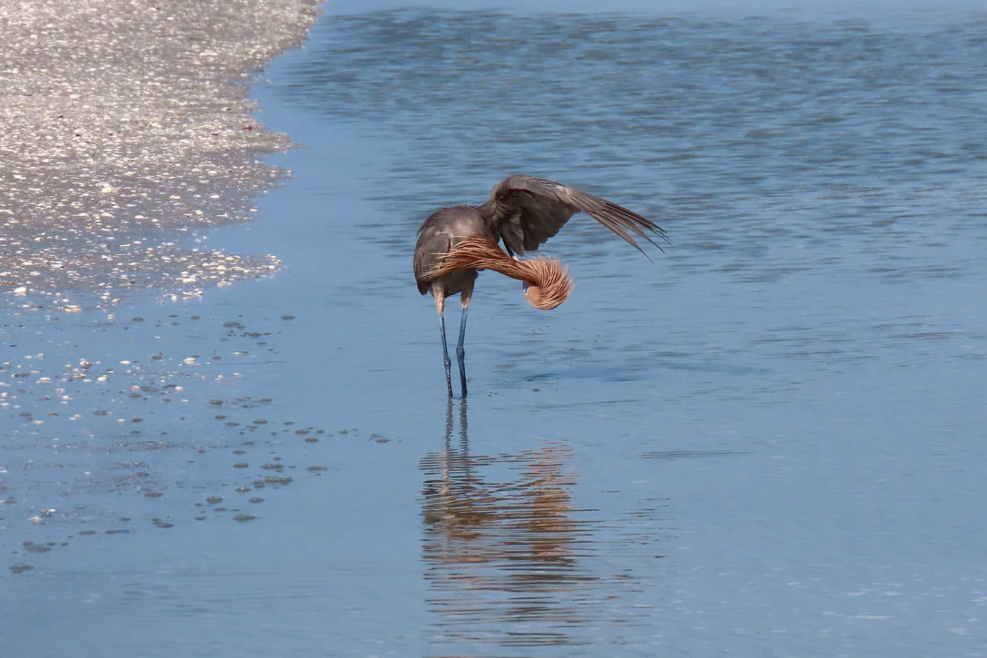 It’s easy to enjoy the presence of reddish egrets, and it can be especially entertaining to watch the canopy shading behavior. However, the SCCF shorebird team reminds residents and visitors to Southwest Florida that observing these birds is best done from a respectable distance.