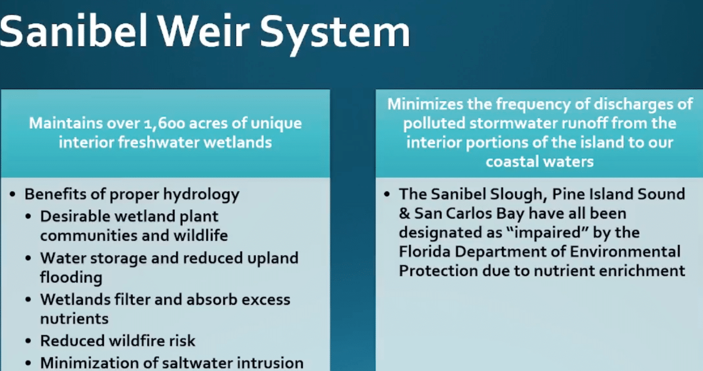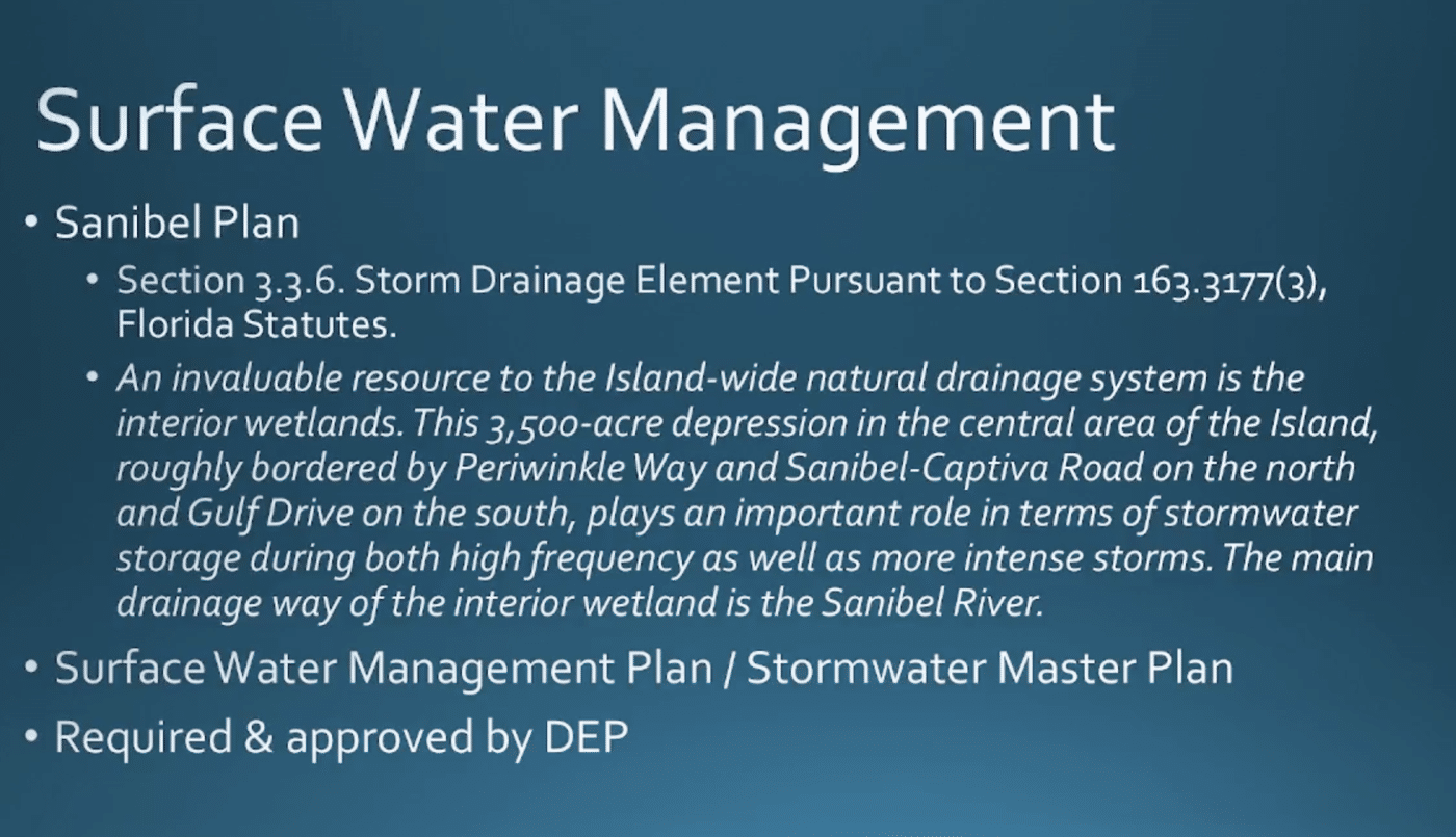“An invaluable resource to the island-wide natural drainage system is the interior wetlands. This 3,500-acre depression in the central area of the island…plays an important role in terms of stormwater storage during both high frequency as well as more intense storms,” she said, quoting the Sanibel Plan.