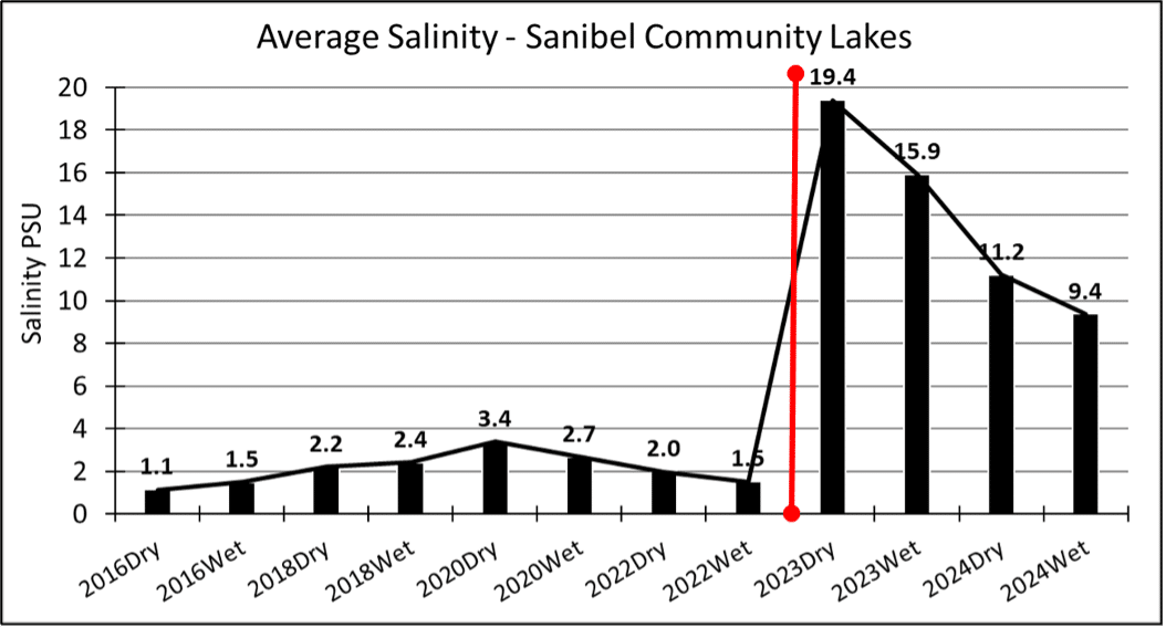 Several formerly freshwater lakes (pre-Ian) such as those at Casa Ybel resort, the Jordan Marsh, and Bailey’s Pond had their salinity significantly reduced during the 2024 precipitation but reverted again to near seawater strength after Debby.