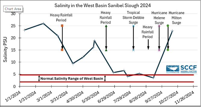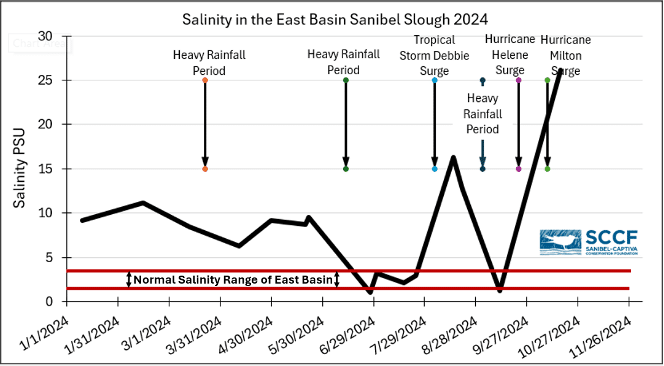 In September, Hurricane Helene passed within 150 miles of Sanibel and brought with it a more significant surge than Debby. Both the east and west basins were impacted with salinity increasing to marine water levels.