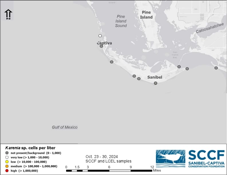 The SCCF Marine Laboratory‘s samples from the beach on Sanibel on Oct. 29 and Oct. 30 did not detect K. brevis.
