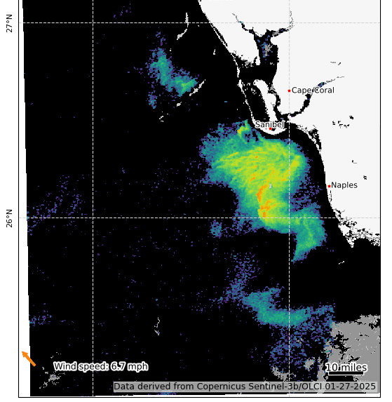 Satellite imagery as well as aerial photography and video shows that the bloom is large and stretches from Sanibel and Captiva to Naples.