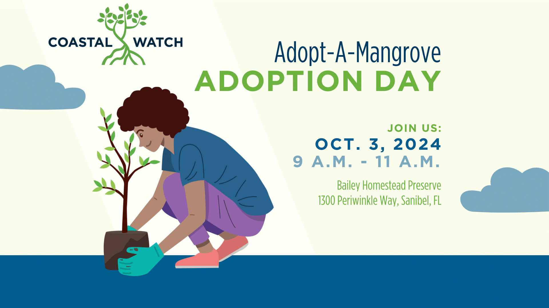 Bailey Homestead Preserve 1300 Periwinkle Way, Sanibel, FL, United StatesNow, more than ever, our coastal ecosystems need your support. We invite you to participate in SCCF Coastal Watch’s Adopt-A-Mangrove Program. Join us on Thursday, Oct. 3, 2024, at the Bailey Homestead Preserve from 9 a.m. – 11 a.m. for Adoption Day! You’ll be able to pick up your mangrove seedlings and everything you need…